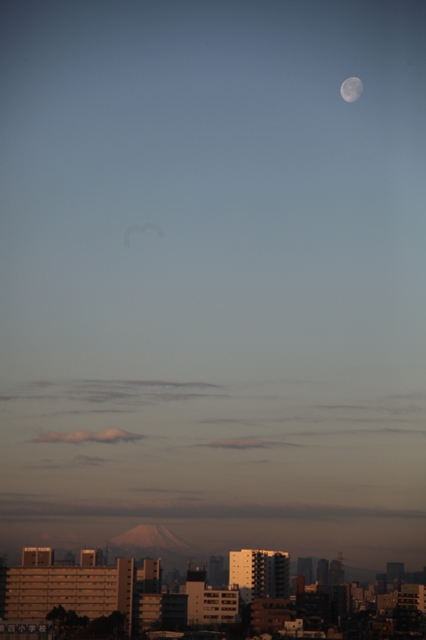 月と富士山が同時に見えた。 その風景を見た瞬間、一瞬にして目が覚めた。 富士山が見えると、なぜかテンションがあがるなぁ。